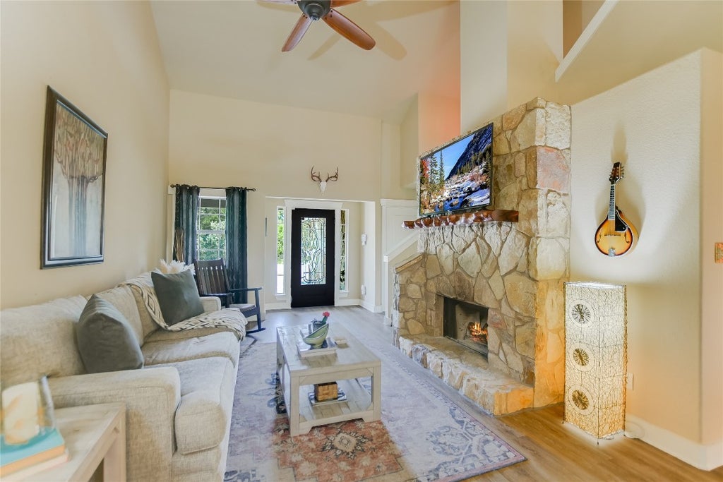 Welcome to this beautifully maintained 3-bedroom, 2.5-bath home with an inviting loft, located in the heart of Woodcreek. Thoughtfully designed for both comfort and function, this home features a cozy primary suite on the main floor, while two additional bedrooms, a full bath, and a versatile loft space await upstairs—perfect for a home office, media room, or play area. Enjoy brand-new (2025) luxury vinyl plank flooring throughout the main living areas, and gather around the cozy wood-burning fireplace in the living room. The kitchen is a chef’s dream, complete with custom cabinetry, granite countertops, a pantry, and stainless steel appliances—including the refrigerator. The upstairs loft comes wired with surround sound, offering a great space for movie nights or gaming. Step outside to a low-maintenance backyard designed for entertaining and sustainability, featuring a covered patio, built-in fire pit, and a rainwater catchment system for eco-friendly watering. Both the front and back yards are xeriscaped, making yard work easy and efficient. Don’t miss this well-appointed home in a peaceful neighborhood—schedule your showing today!
