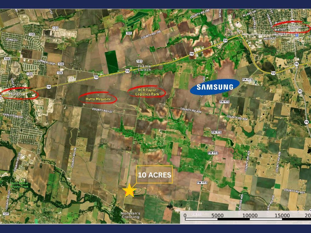 Exceptional 10.01-acre unrestricted parcel, perfectly positioned nearly equidistant from Hutto and Taylor, only 5 miles from Samsung’s Semiconductor Plant. Located 6 miles south of RCR Logistics Park (and on the same road) and 4 miles south of Hutto Megasite, this level lot offers excellent access to HWY 79, FM 973, and the 130/95 toll road interchange. No FEMA floodplain. Ideal for commercial, industrial, and residential development in the thriving Hutto ISD. A prime opportunity!