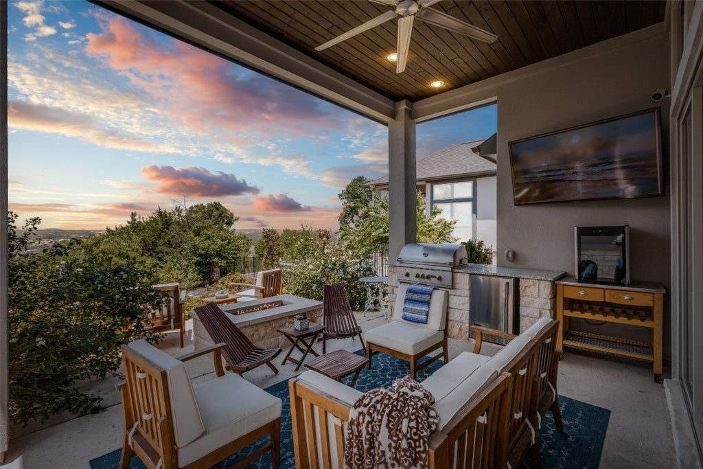 FULLY FURNISHED, Stunning Hill Country Retreat in Gated Ventana, nestled in the rolling hills of Santa Rita Ranch just north of Austin (30 minutes to downtown). This exquisite 3-bedroom, 2-bathroom residence combines luxury, comfort, and convenience with breathtaking sunset views that stretch for miles. Step outside to your own private outdoor sanctuary featuring a covered patio with a full outdoor kitchen—built-in grill, refrigerator, gas fire pit, and mounted television—perfect for entertaining or unwinding while watching the sun dip below the horizon. Inside, the heart of the home is a chef’s kitchen equipped with premium appliances: a Thermador gas stove, Bosch dishwasher, Frigidaire refrigerator, built-in microwave, walk-in pantry, and convenient water filtration at the sink. The open layout flows seamlessly into the living area, highlighted by a cozy fireplace, plantation shutters, and brand-new LVP flooring throughout. The primary ensuite is a true retreat, boasting a spa-like bathroom and a massive walk-in closet with a professional organizing system. Additional features include a separate laundry room with new washer and dryer, water softener, tankless gas water heater, mud room, and spacious 2-car garage. Enjoy a low-maintenance lifestyle with the HOA covering front and back lawn care, irrigation, and seasonal flower planting. Ventana residents also have access to incredible amenities: multiple swimming pools, fitness gym, walking trails, playgrounds, splash pads, basketball courts, and more. If you are not in need of a FULLY FURNISHED home, then let us know. We can easily adjust. So if you are looking for the most beautiful settings in Central Texas - LOOK NO FURTHER - upscale finishes, modern convenience, and resort-style living. A true LOCK and LEAVE—no lawn maintenance, no irrigation worries, and truly VIEWS FOR MILES!