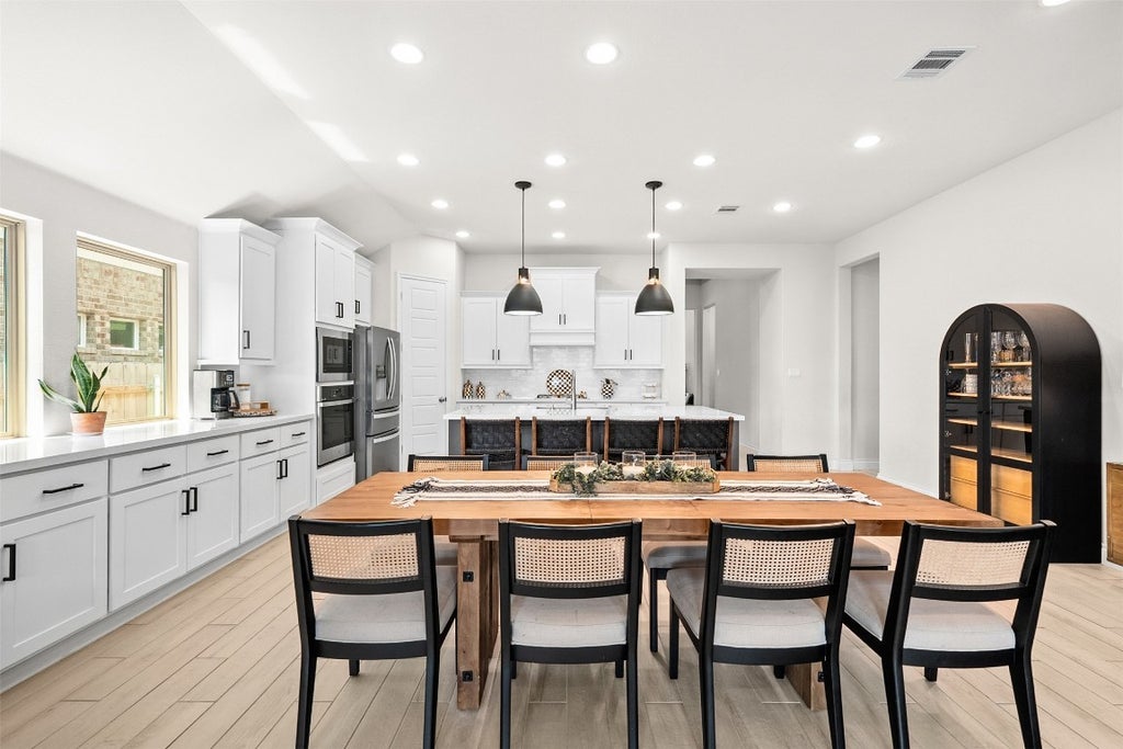 Welcome home to 512 Monrovia Court, a generous opportunity to move into a coveted section that is rarely offered and strategically zoned for the highly accredited Liberty Hill School District, within the master planned community of Santa Rita Ranch. Situated on a cul-de-sac and just a quick walk to two of the 3 amenity centers this home has access to, the location of this home couldn't get any better. Now enter through the covered porch and admire the open floor plan that boasts tall ceilings and ample lighting. A bright office or playroom, access to the oversized garage and a nice drop zone all welcome you at the front of the home. Heading toward the kitchen is an en-suite with a private bedroom and full bathroom with walk in closet. The upgraded kitchen boasts stylish pendant lighting, tons of cabinetry and a large pantry, a farmhouse sink in a large island plus an additional counter space on the side. All of this overlooks the open concept with a large living room and access to the fully turfed backyard. There's a private wing with two nicely-sized bedrooms and a full bathroom as well as a laundry room. The back of the home features a private primary bedroom with a thoughtfully designed bathroom flowing into two large walk-in closets. Living at 512 Monrovia Court comes with the perk of living in Santa Rita Ranch, an award winning community that never falls short of activities and amenities, including access to all sections of the ranch which (at present) totals- 4 swimming pools, pickleball, volleyball and basketball courts, 4 playgrounds, tons of trails, several lakes, a dog park, indoor meeting space with a brewing coffee machine, splash pads, water slides, and a full-time activities director. Living at 512 Monrovia means a neighborly 16 minute walk to the new on-site Tierra Rosa Elementary School, 512 Monrovia and Santa Rita Ranch welcomes you home.